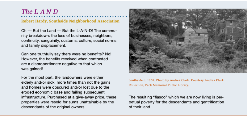 Many still remember the days when, before urban renewal, Black people owned hundreds and hundreds of homes and businesses in vibrant interconnected neighborhoods throughout Asheville. As Calder’s article and others share, urban renewal led to a traumatic loss of culture and community as well as property on which to build wealth for their families. Many were moved public housing units which they did not own, and since then white Asheville has been all to comfortable to ignore these isolated communities, blaming issues such as gun violence on the people who have been trapped inside for generations, not on the system that trapped them.