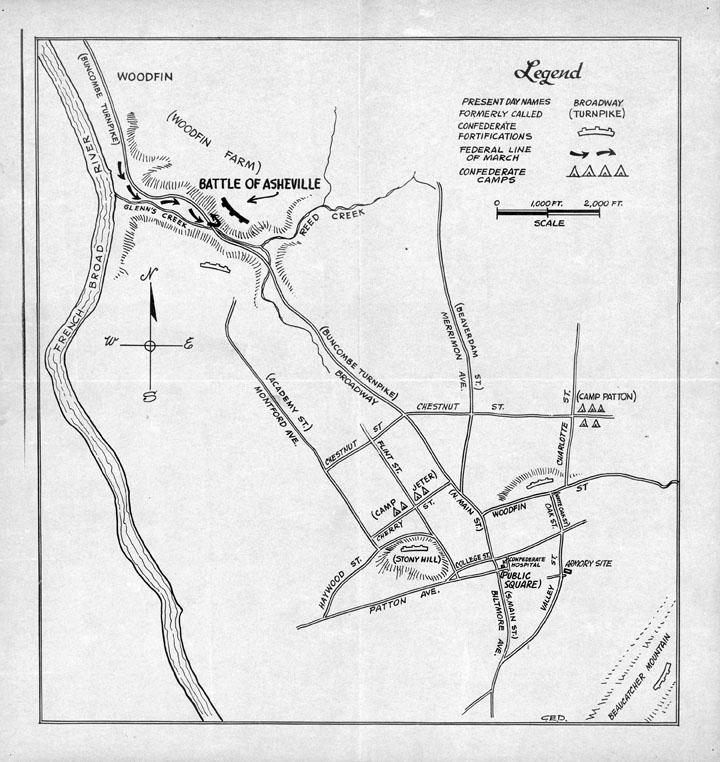 1865 (April 6) – The Battle of Asheville occurs along Reed Creek (which at the time was called Glenn Creek, the current name of the creek along W.T. Weaver Boulevard, as shown in this map). Col. Isaac Kirby’s Union troops fought those of Confederate Col. George Wesley Clayton. After five hours or so, Kirby retreated, fearing rain and Confederate reinforcements.